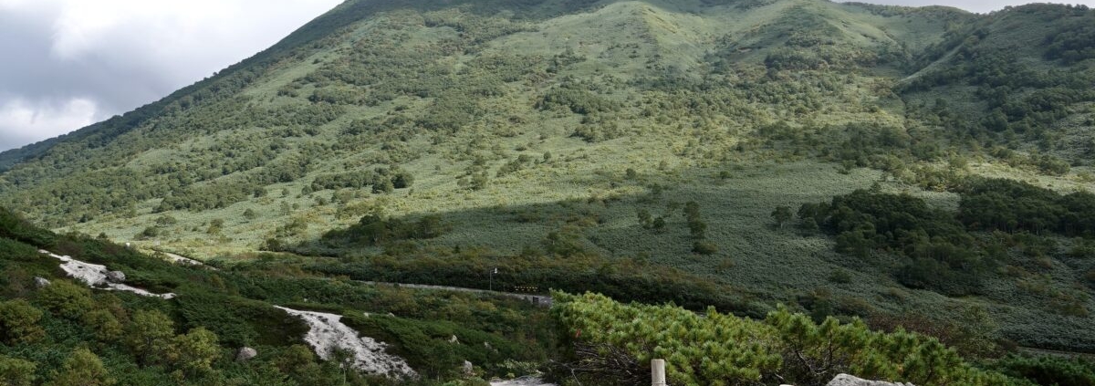 恵岱岳の斜面はダケカンバの林で、その麓にはチシマザサが群生している。