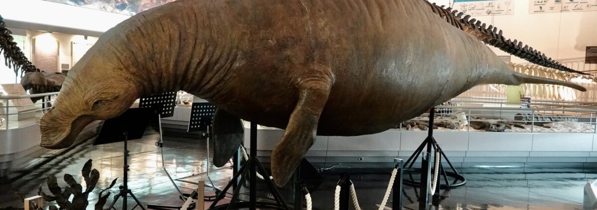 カイギュウは海に棲む哺乳類のうち、唯一の草食の生き物で、海藻のよく育つ浅い海に暮らす。滝川は今は平野だが、500万年前にはクジラやイルカ、サメなどが暮らす海だった。