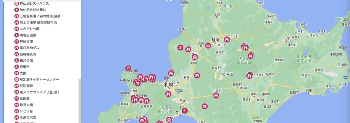 この本には日本の地質や地形の解説とともに各地の魅力的なジオパークが紹介されていて、あちこち行ってみたくなる。2023年9月現在、日本にはジオパークに認定されている地域が46地域あるが(日本のジオパークマップ)、日本は広いので、まずは私の故郷、北海道から回ってみることにしよう。レンタカーを借りて夫と二人で約3週間かけてできるだけ多くの、なるべくバラエティに富んだジオサイトを巡るという企画を立てた。札幌を起点に、主に道央を回る。