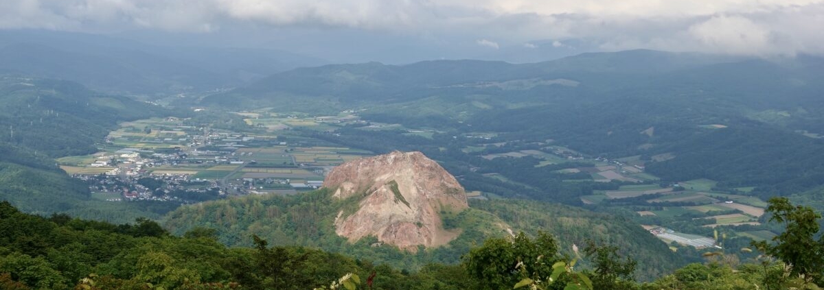 丸く高く盛り上がった溶岩ドームの周りには緑色の尾根山が低く広がっていて、上から見るとなんだか新鮮な卵で作った目玉焼きみたい。有珠山は活動の場を変えながら噴火を繰り返し、次々と新山を作って行くのが特徴。有珠山から噴出するデイサイトと呼ばれる粘り気の強い溶岩は流れにくく、地面を押し上げて新しい山を作ったり、地表に現れて溶岩ドームになる。昭和新山よりも以前の明治時代にできた新山は「明治新山」と名付けられている。明治の噴火の後に温泉が発見されたことで洞爺湖温泉が発展することになった。