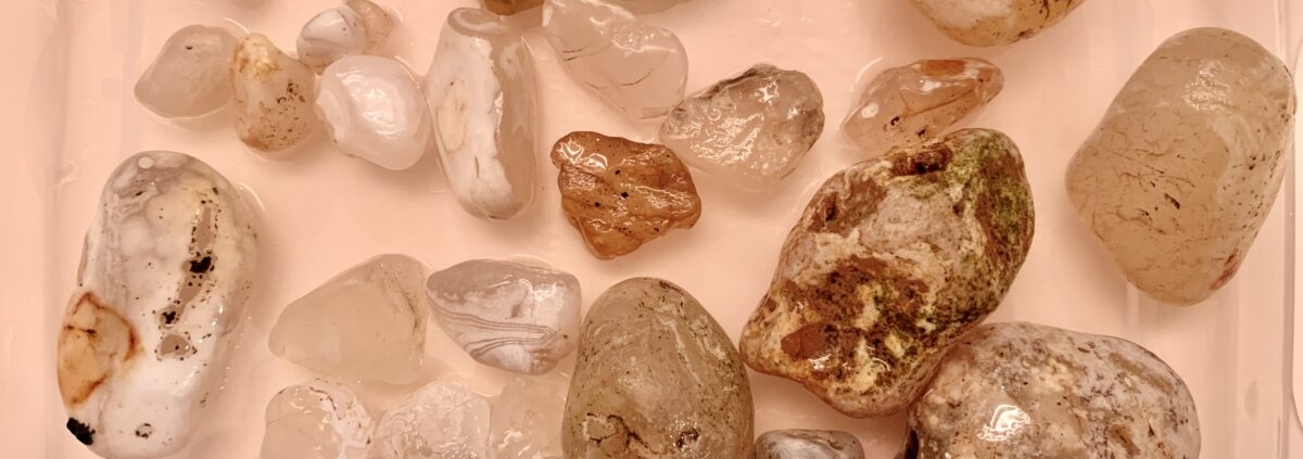 白メノウとオレンジっぽいメノウ。メノウ拾いは初めてなので、関係ないのも混じっているかも。