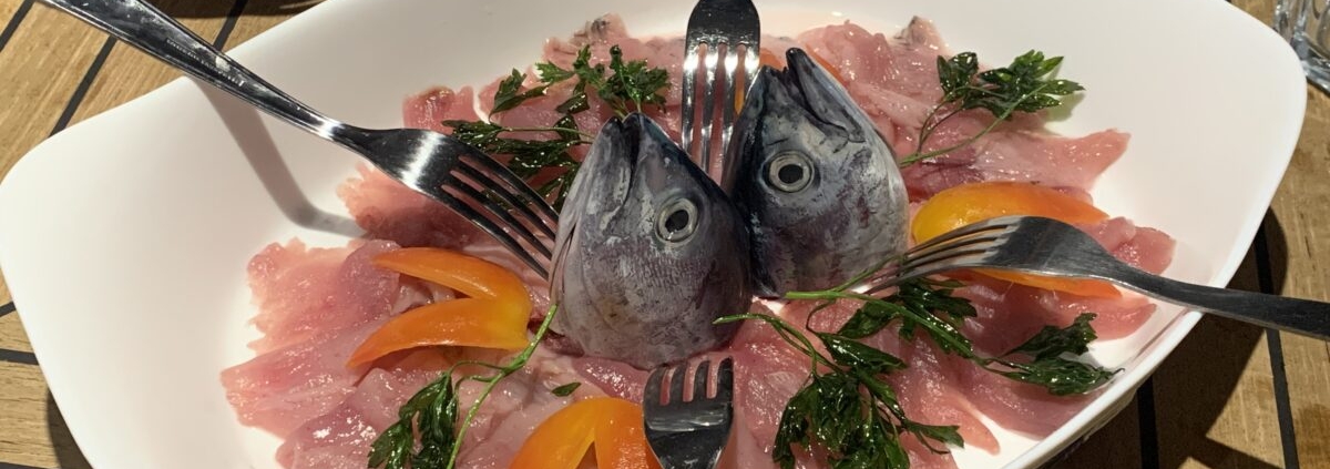 船の上の小さなキッチンで作り出される美味しい料理の数々には本当にびっくり。献立はあらかじめきっちり決まっていたわけではないようだ。初日に「ベジタリアンの方、食物アレルギーのある方はいますか?」と聞かれた。私たちの中にはベジタリアンの人も重大なアレルギーを持つ人はいなかった。もし、いたら対応してくれていたのだと思う。冷凍庫にはお肉が入っていて、もし私たちが「また魚か」という反応をすれば、お肉中心のメニューになっただろう。皆がお魚を美味しい、美味しいと言って大喜びで食べるので、コックさんは張り切って連日、お魚料理を作ってくれたのだ。メインの食材がその日釣れたお魚なので、安上がりの食事である。でもそれが逆に大変な贅沢で、食事にそれほど期待していなかっただけに、喜びが大きかった。