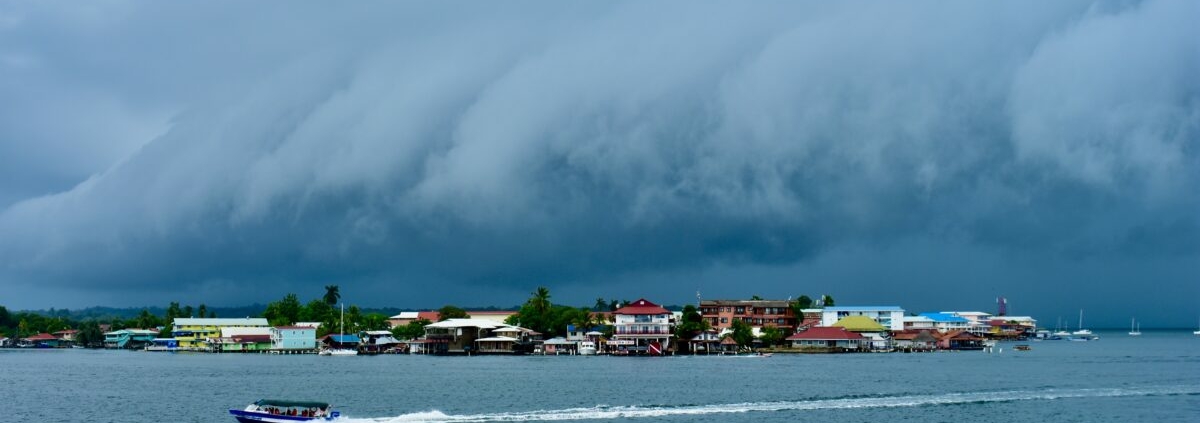 さようなら、雷アイランド。島を離れるフェリーからボカスタウンを眺めると、上空にはまたもや雨雲が。あの雲ともお別れかあ。と思ったら、雨雲はフェリーについて来たのだった。しかも、雲の方が動くスピードが速く、途中で追い越された。アルミランテに上陸した私たちは土砂降りの中をドライブすることになってしまったよ。