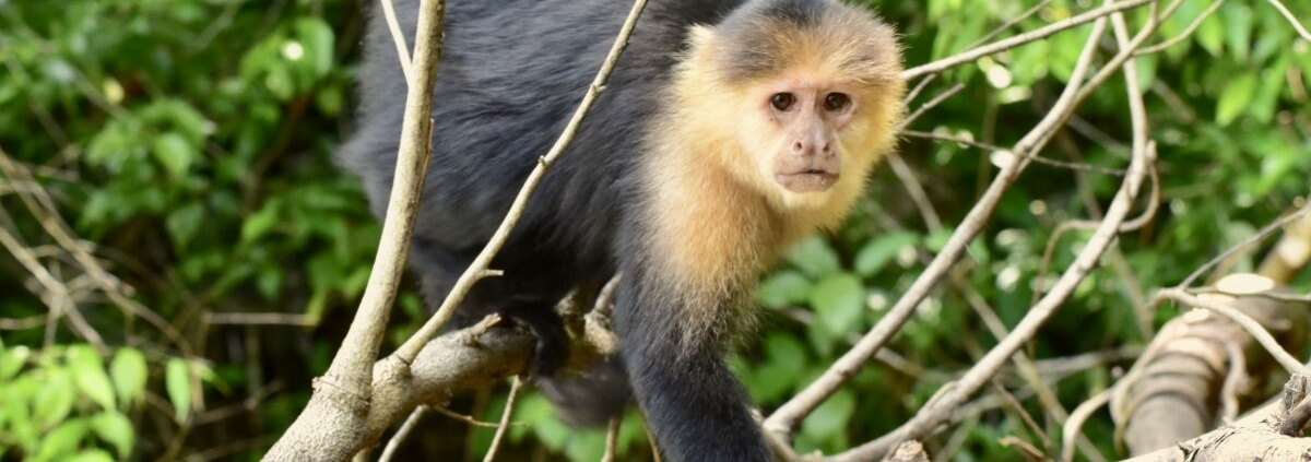 ボートから水鳥や亀、魚を眺めて楽しんでいると、そのうちにボートの運転手が「サルを見せてやる」と言って小島の岸辺にボートを寄せた。「バナナ持ってる?」と聞かれたので「ない」と答えると、「ちぇっ。ないのか」と言いながらも島の木々の上の方に向かって奇声を発してサルを呼んでくれた。餌をもらえると期待したノドジロオマキザルが数匹、木を降りて来た。枝伝いにボートに近づいて来る。