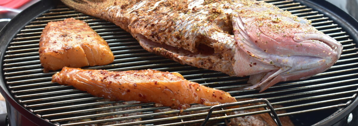 濡らしたウッドチップを炭火に投入し、釣れた魚をスモークする。