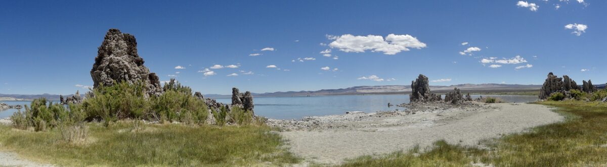 白っぽくゴツゴツした柱状の岩が広い湖の水面からニョキニョキと突き出している。この不思議な風景は、ヨセミテ国立公園の東側の外れにある。