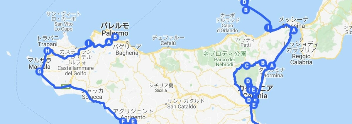 自宅からオーストリアを抜けてイタリア本島を南下し、カラブリア州ヴィラ・サンジョヴァンニ(Villa San Giovanni)の港から車ごとフェリーでシチリア島のメッシーナ(Messina)に渡り、帰りはパレルモ(Palermo)から夜行フェリーでナポリ(Napoli)へ移動、そこから北上して帰って来た。シチリアへ到着してからの移動ルートは以下のマップの通りである。エオリエ諸島のリパリ島へも車ごとフェリーで渡り、その他の島へは小型ボートで移動した。