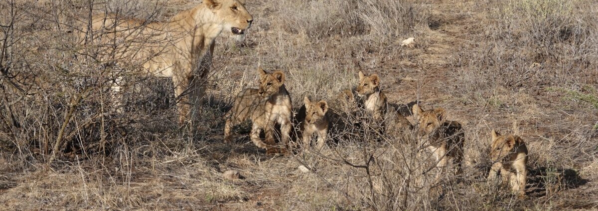 サファリカーに乗り込んだ私たちは、真っ先にライオンの寝ぐら付近へと向かった。すると、近くの原っぱに赤ちゃんライオンを連れたメスたちが歩いているのが見えた。