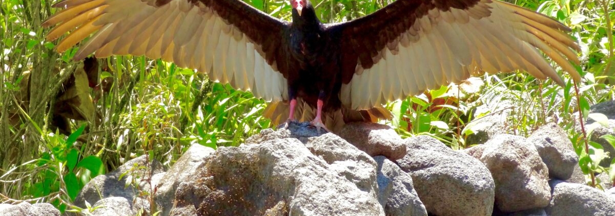 子どもの頃から「コンドル」と聞くと、羽を大きく広げて広い空を優雅に飛ぶ姿が目に浮かび、なんとなく憧れがあった。しかし、パナマやコスタリカで実際のコンドルを目にするようになって、すっかり印象が変わってしまった。そう、コンドルは「ハゲタカ」と総称される、腐肉を食べる野鳥の仲間なのだ。生き物の死骸に群がり、肉を食いちぎる様はグロテスクで優雅なイメージとは真逆である。でも、頻繁に姿を見かけるだけに、気になる野鳥である。