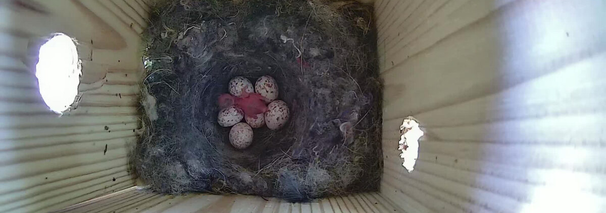 卵を7つ産んで、4/11に抱卵を開始。巣材で器用に丸い窪みを作って、ハウス2のアオガラの巣とは大違い。