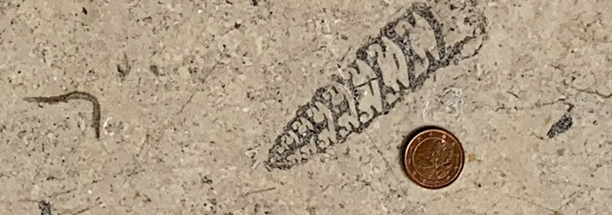 化石探しが楽しくて、人々が通りすぎる中、ビルの入り口でしゃがみ込んで床の写真を撮る変な人になってしまった。ここの床は今回の街角地質学ごっこで一番気分が上がった場所だ。街角地質学をやりに出て来て良かったと感じた。ただ、ベルリンで街角地質学をやる際、困ることが一つある。それは、ベルリンの町が汚いこと。このフリードリヒ通りはまだマシな方ではあるけれど、せっかくの素晴らしい石材が使われていてもロクに掃除がされていないので、ばっちくて触りたくないのだ。写真を撮るとき、化石の大きさがわかるようにとコインを置いたものの、そのコインをつまみ上げるのも躊躇してしまう。