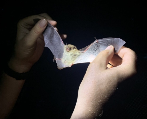 捕獲した個体は、種類、大きさ、重さ、性別、大人のコウモリかそれとも子どものコウモリか、などを確認して記録する。